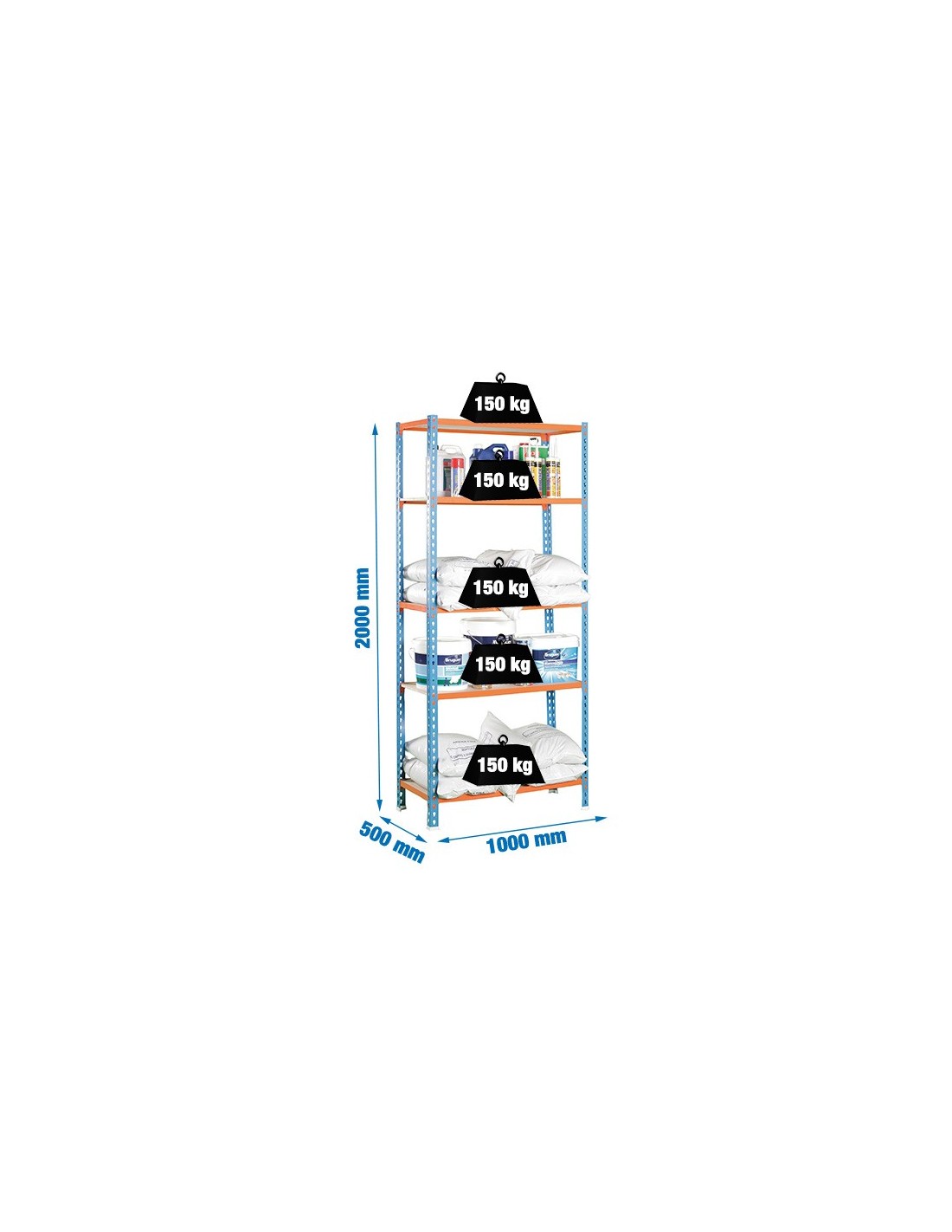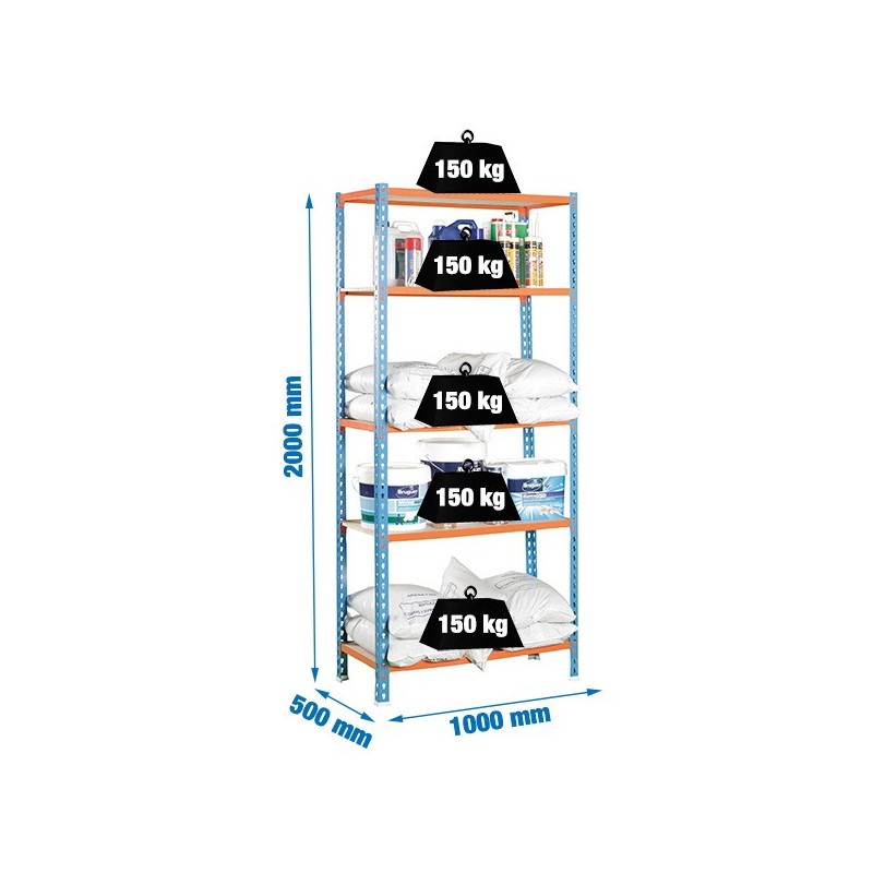 Capacidad de carga: 150 kg/balda. Color naranja RAL 2004 y azul RAL 5015. Composición: 8 perfiles de 1000 mm, 5 aglomerados de 1000x500 mm, 10 largueros de 1000 mm, 6 largueros de 500 mm, 4 pies de plástico y 1 cartel descriptivo del product