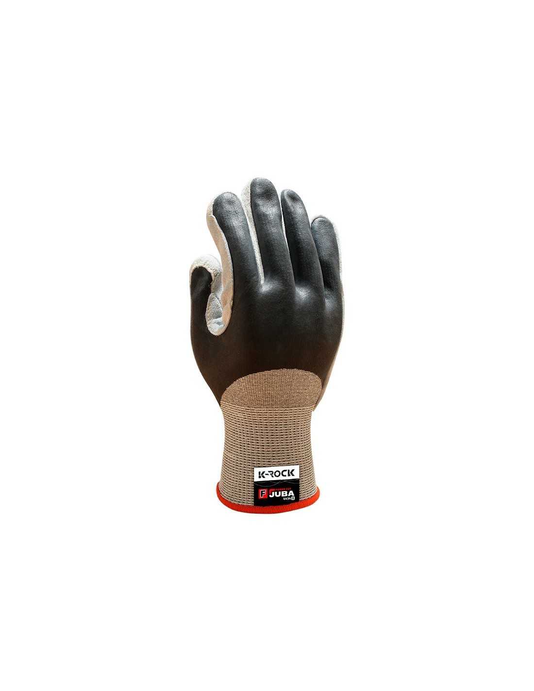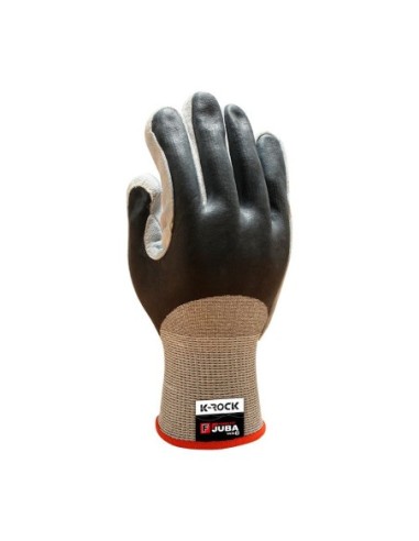 Guante con fibra resistente al corte K-rock®, recubierto de nitrilo T-touch en palma y medio dorso y piel de serraje hidrofugada en palma.. Características