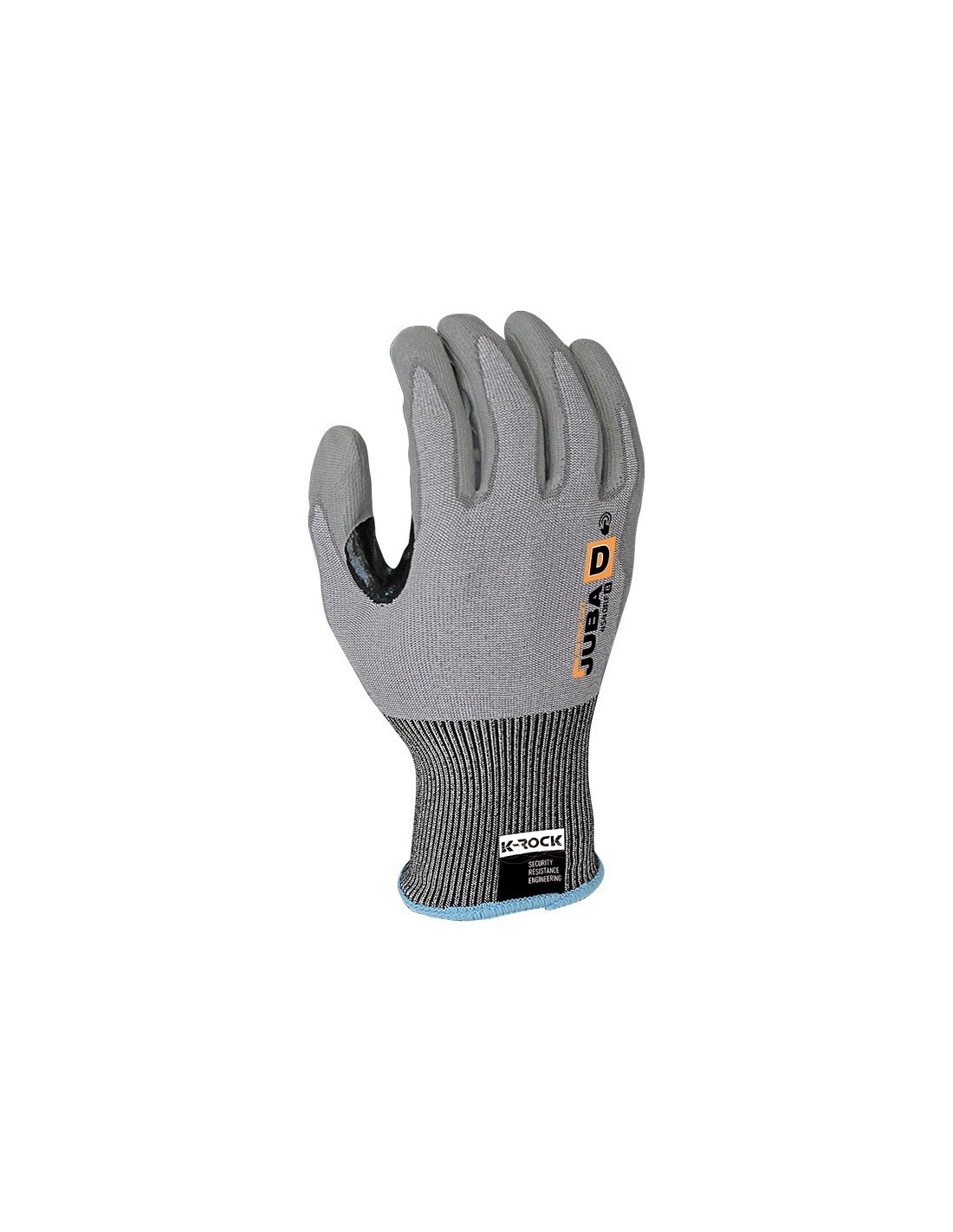 Guante con alta resistencia al corte que incorpora la fibra textil K-ROCK®, la nueva tecnología de corte de Juba, recubierto de poliuretano en la palma.. Características