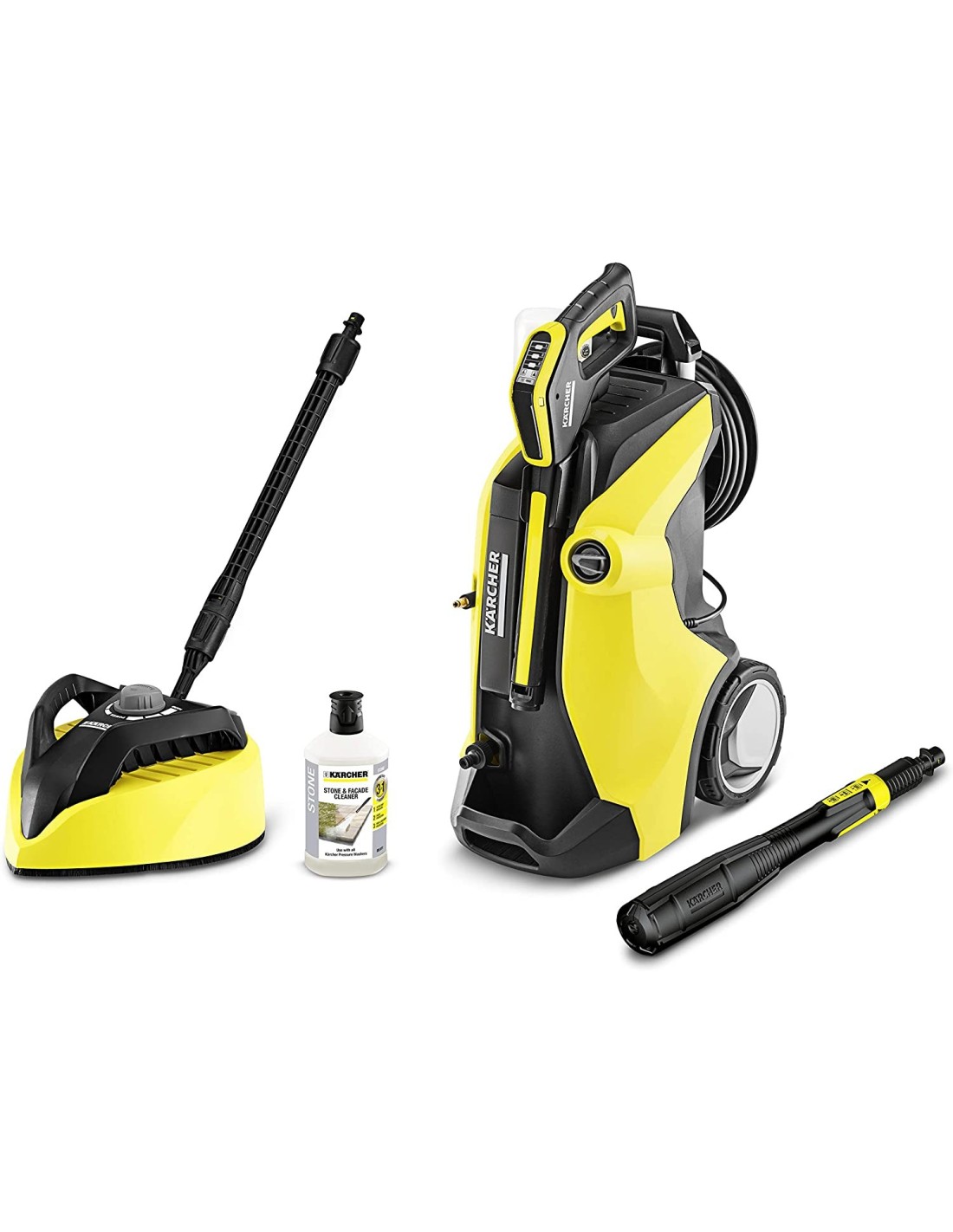 1 x hidrolimpiadora, 1 x manguera de alta presión, 1 x pistola alta presión G 180 Q FC Plus, 1 x lanza alta presión Multi Jet 3 en 1, 1 x cepillo T-Racer T 450, 1 x litro de detergente para fachada y piedra 3 en 1