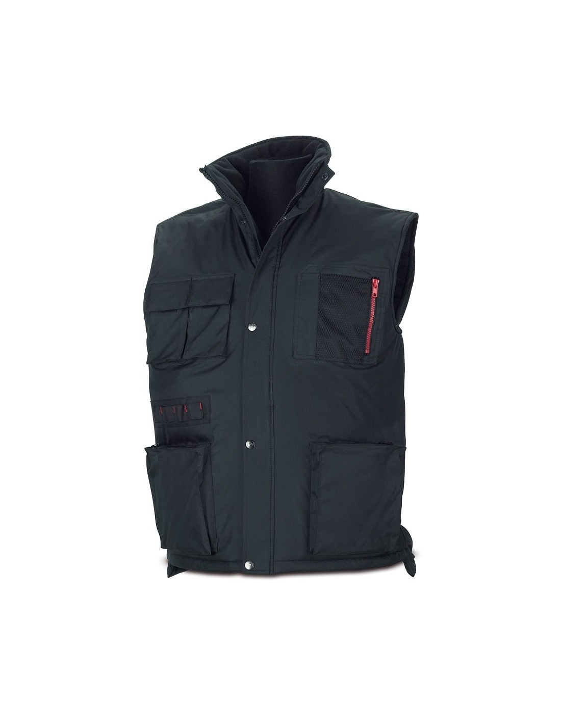 Tejido exterior de poliester PVC con un tratamiento repelente al agua. Interior de forro polar en parte superior y nylon en la parte baja. Guata poliester de 200g. Dobles bolsillos frontales unos con cremallera y para manos en la parte baja. Dos bolsillos con velcro en la parte superior derecha. Bolsillo con cremallera y superpuesto otro de malla en la parte superior izquierda. Cinta porta utensilios en la parte media derecha del chaleco. Cierre por cremalera de diente ancho y tapeta cortavientos con botones metálicos a presión.