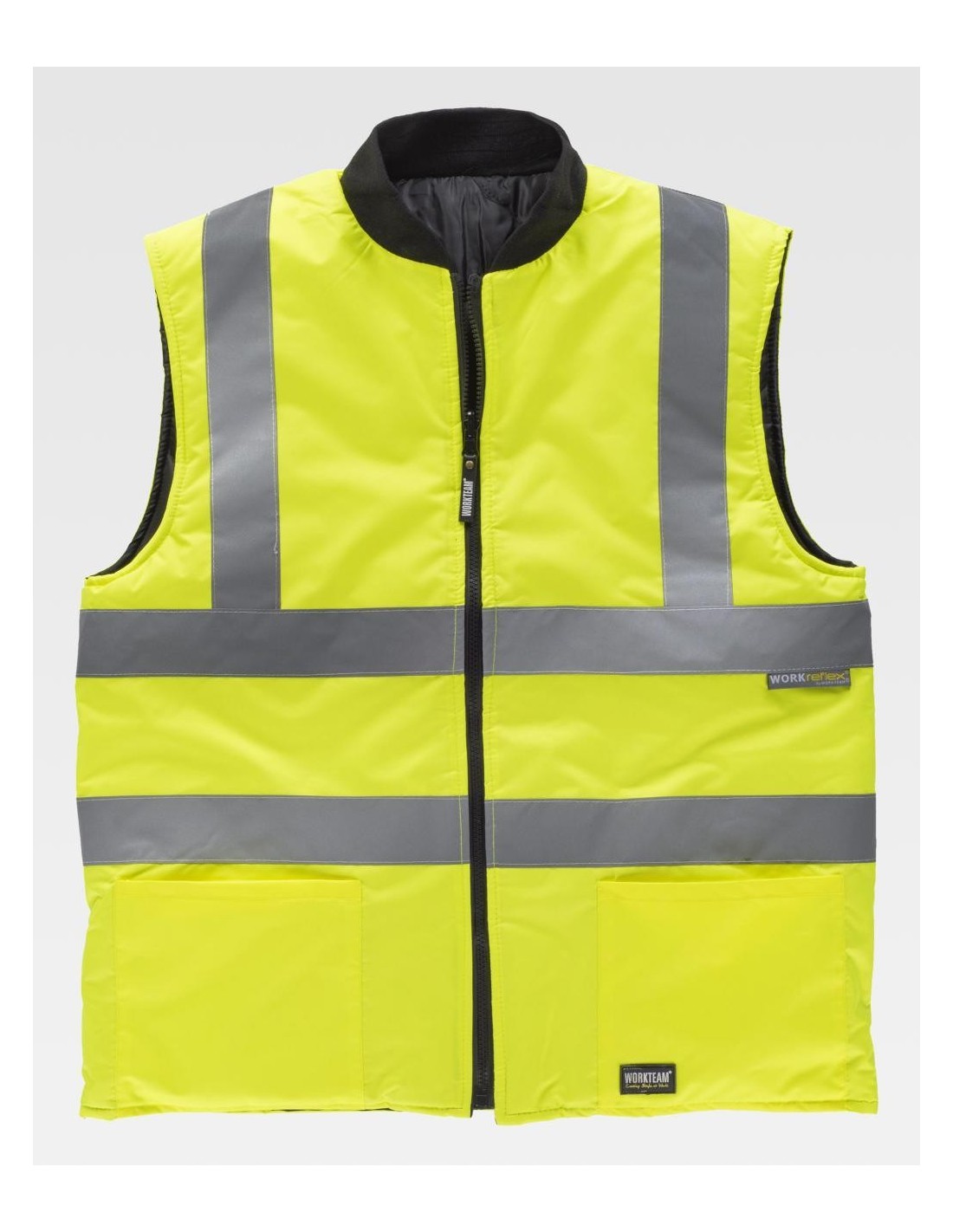 Chaleco reversible, acolchado, de alta visibilidad en tejido Oxford con cintas reflectantes. Cuello mao en punto elástico y cierre de cremallera de nylon a contraste. Dos bolsos laterales de plastón. Una cinta reflectante en hombros y dos en pecho y espalda. Interior acolchado pespunteado a rombos con dos bolsos laterales de plastón de abertura inclinada.