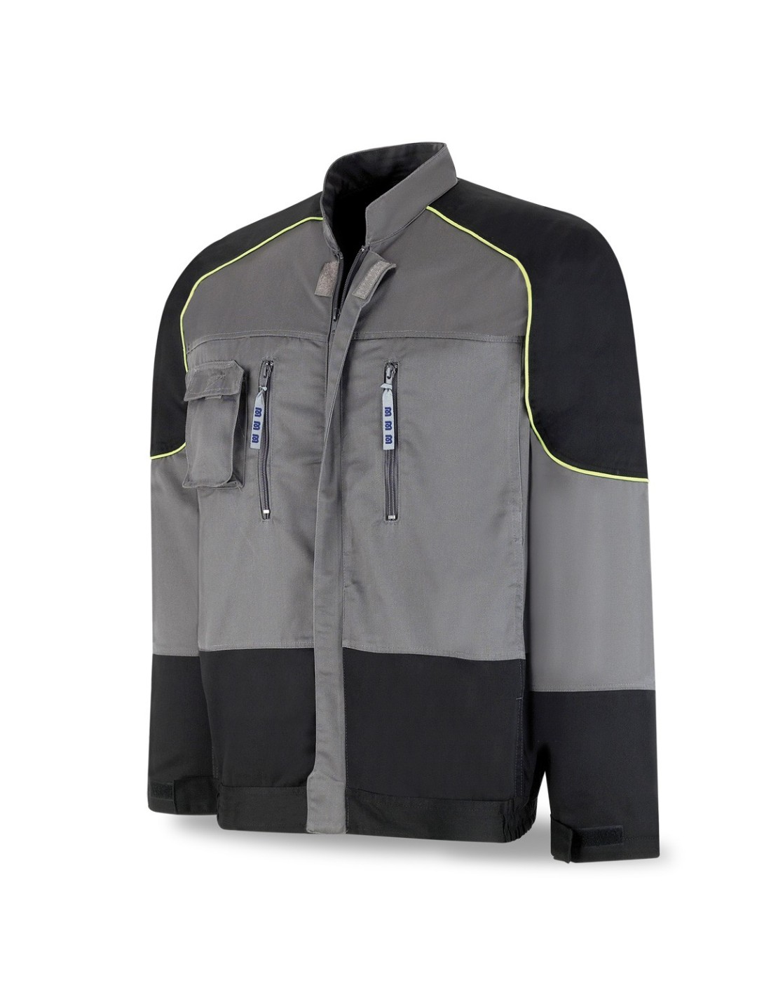 Chaqueta tergal 245 g. Color gris oscuro/negro.. Ribetes en amarillo fluorescente. Tapeta cubre cremallera con velcro. Puños ajustables con velcro. Dos bolsillos normales. Dos bolsillos en pecho con cremallera. Bolsillo para móvil.