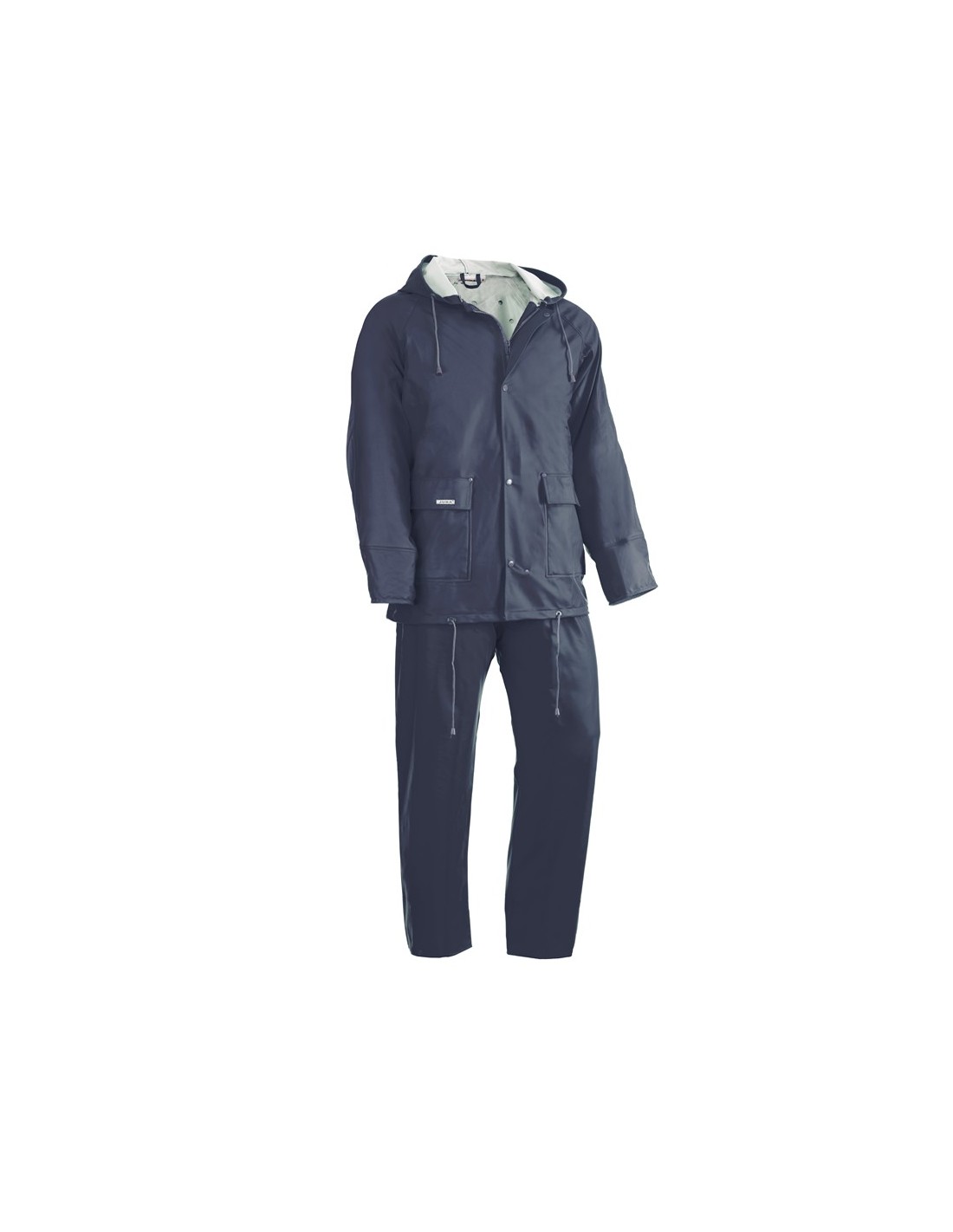 Chaqueta con capucha externa fija. Cierre frontal con cremallera y botones a presión. Pantalón con goma elástica en la cintura. 100% poliuretano sobre soporte en poliéster tricotado. Espesor de 0,40 mm.
