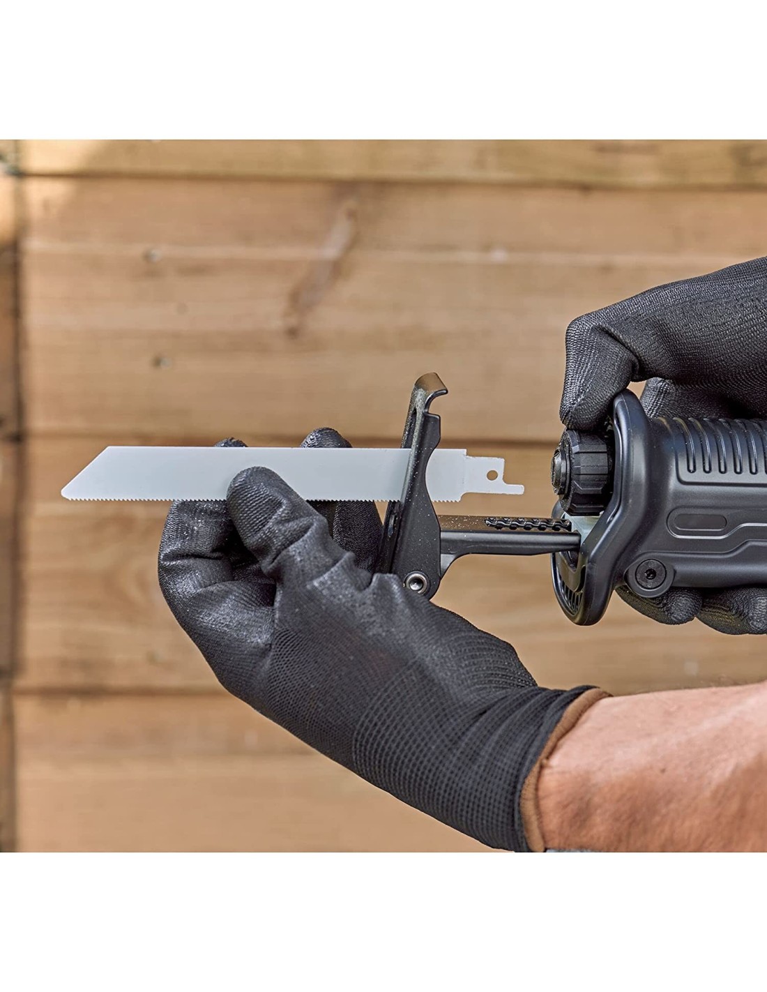 Sierra Sable 750W, velocidad variable 0 - 2.800 cpm, longitud de carrera 20mm, capacidad máxima de corte (madera) 150mm, capacidad máxima de corte (metal) 10mm, sistema de cambio rápido de la hoja. Incluye 1 hoja de sierra para madera, 1 hoja de sierra para metal y soporte para ramas extraible.