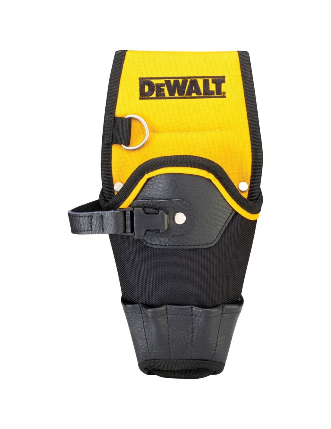 La correa de cuero y la hebilla de liberación rápida mantienen el taladro firmemente en su lugar