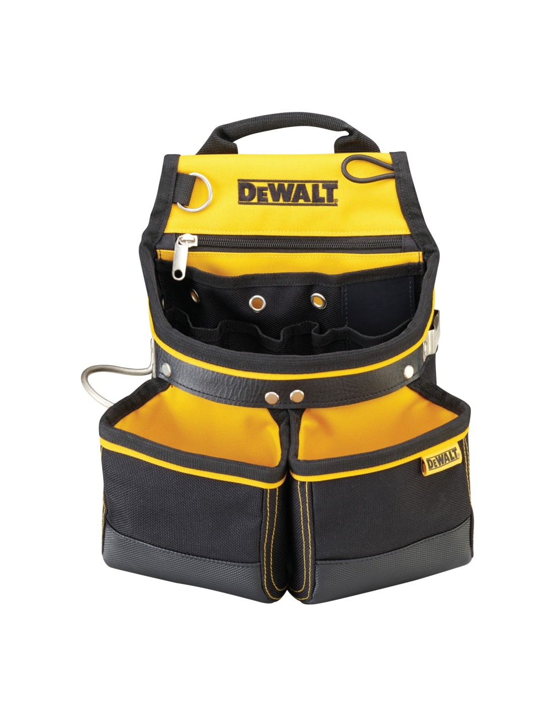 con anillo de metal para el martillo. Gavetas de los organizadores DEWALT caben en los bolsillos, base de PVC que protege contra el desgaste, dos bolsillos delanteros, gran bolsillo con cremallera, bolsillo especial para sierra, clip porta-flexómetro de metal integrado.