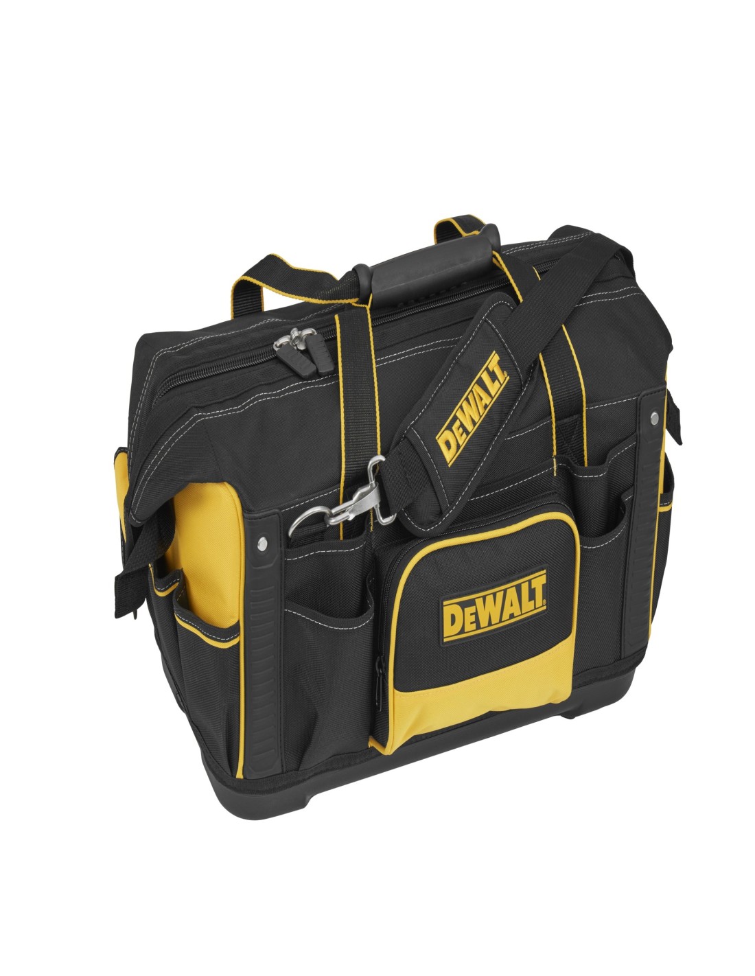 Máxima organización - multiples bolsillos interiores y exteriores para organizar las herramientas. Banda almohadillada para colgar al hombro. Resistente base de propileno inyectado para protener el contenido de la humedad y la suciedad de la obra. MedidaS: 50x30x31cm