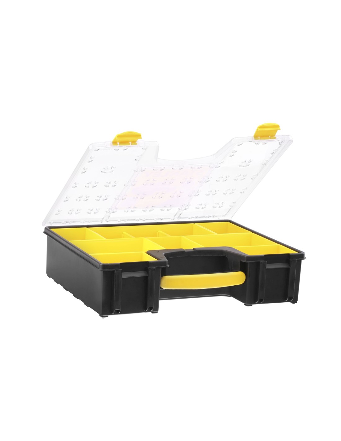 Pequeños compartimentos extraíbles. Tapa transparente de polipropileno resistente con guías que inmovilizan los compartimentos