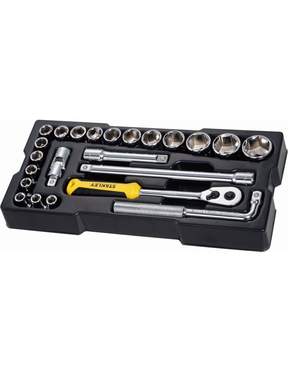 - Carraca: Bloqueo de seguridad de los vasos, palanca de sentido de giro con indicador, acero al cromo-vanadio, empuñadura bi-material resistente a químicos