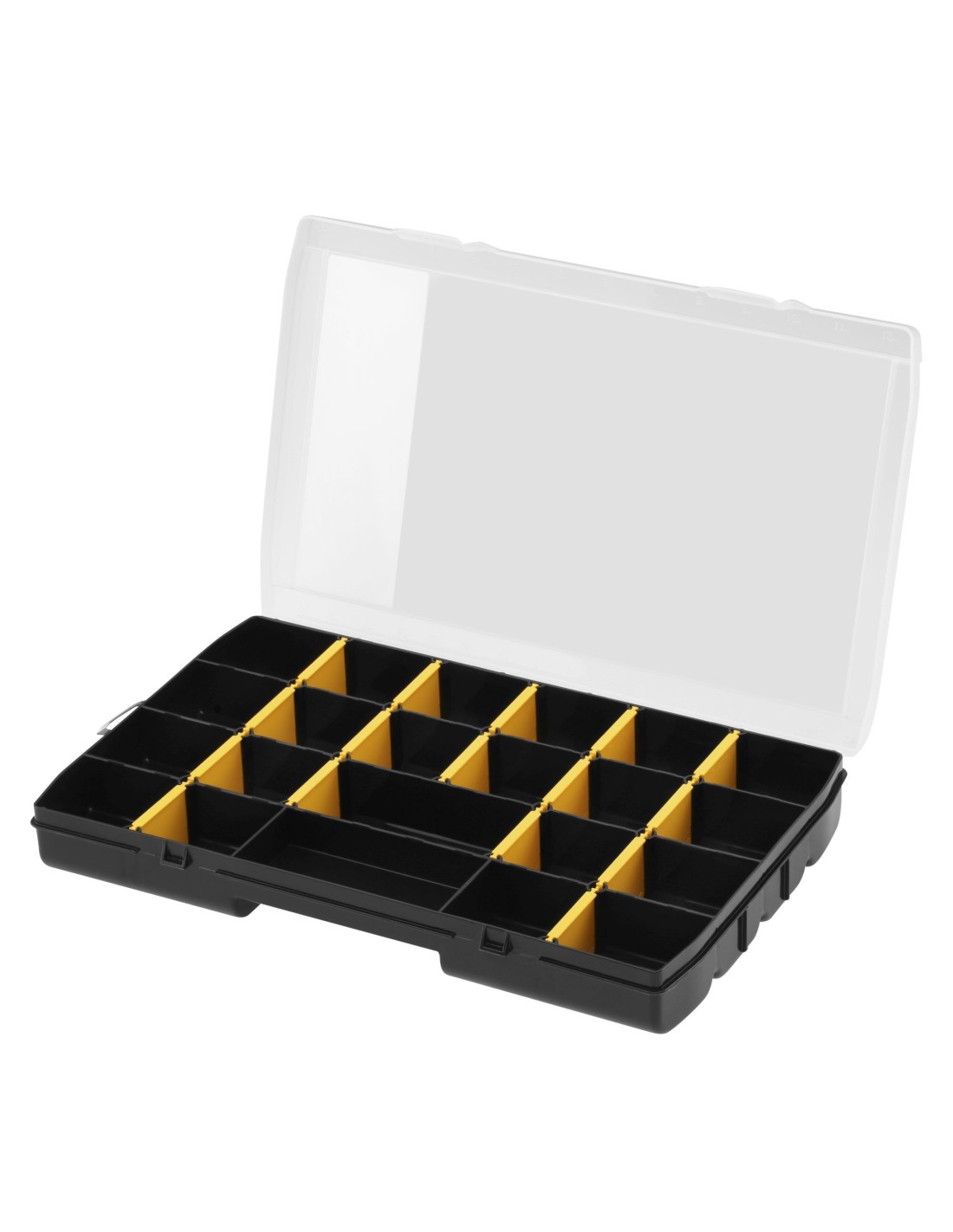 Divisores extraíbles para una alta posibilidad de personalización para piezas pequeñas y para herramientas manuales. Regla marcada en la tapa. Polipropileno de alto impacto. Dimensiones: 35,7 x 22,9 x 4,8 cm. Número de compartimentos 23.