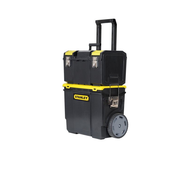 Caja de herramientas extraíble con dos compartimentos en la tapa para almacenar piezas pequeñas, organizador extraíble entre la caja de herramientas y la gaveta inferior. Ruedas de 17,8 cm, mango telescópico y cierres metálicos para conectar ambas unidades