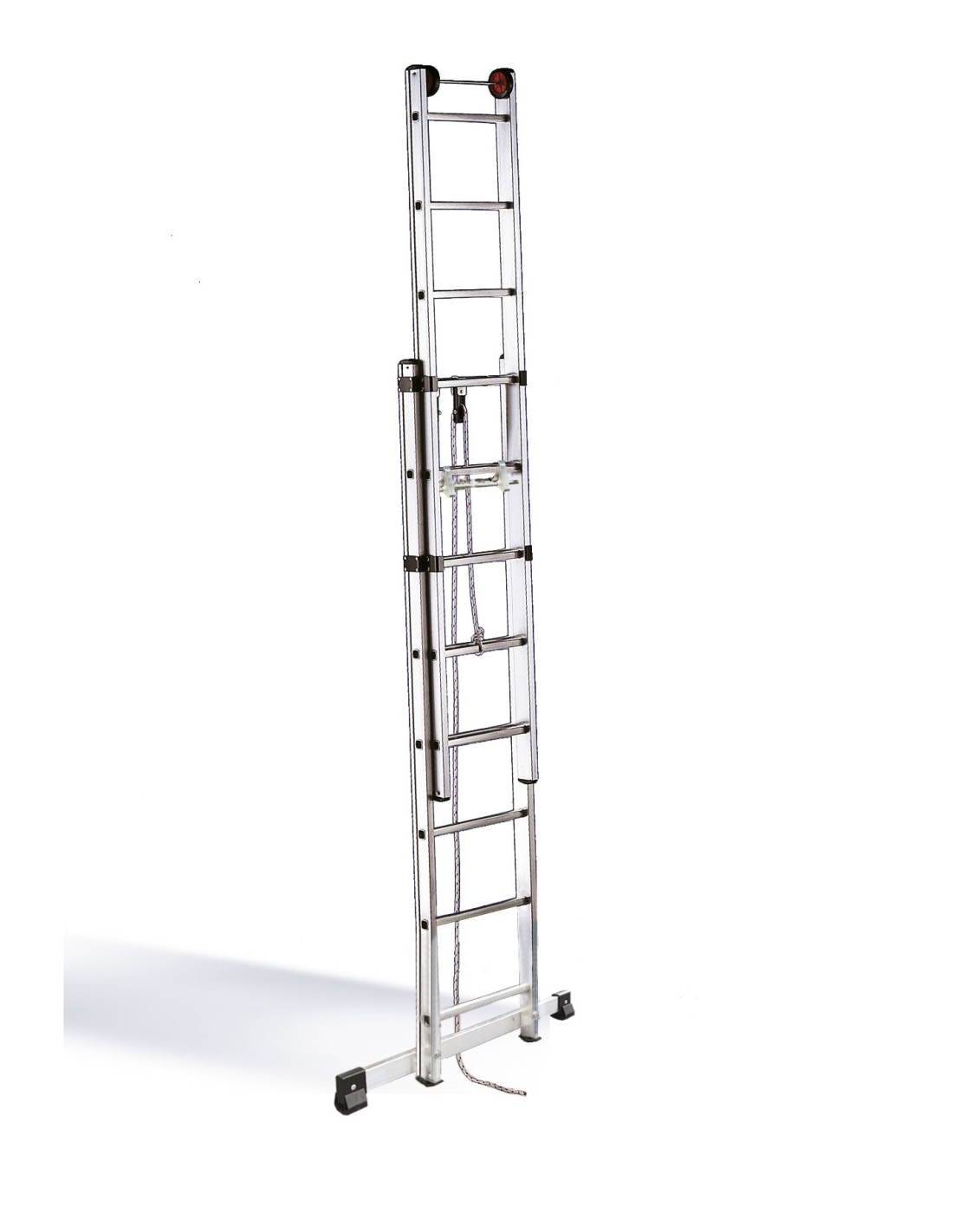 Escalera profesional de dos tramos de aluminio extensible manual mediante cuerda para trabajar en apoyo.
