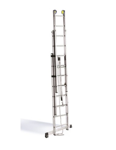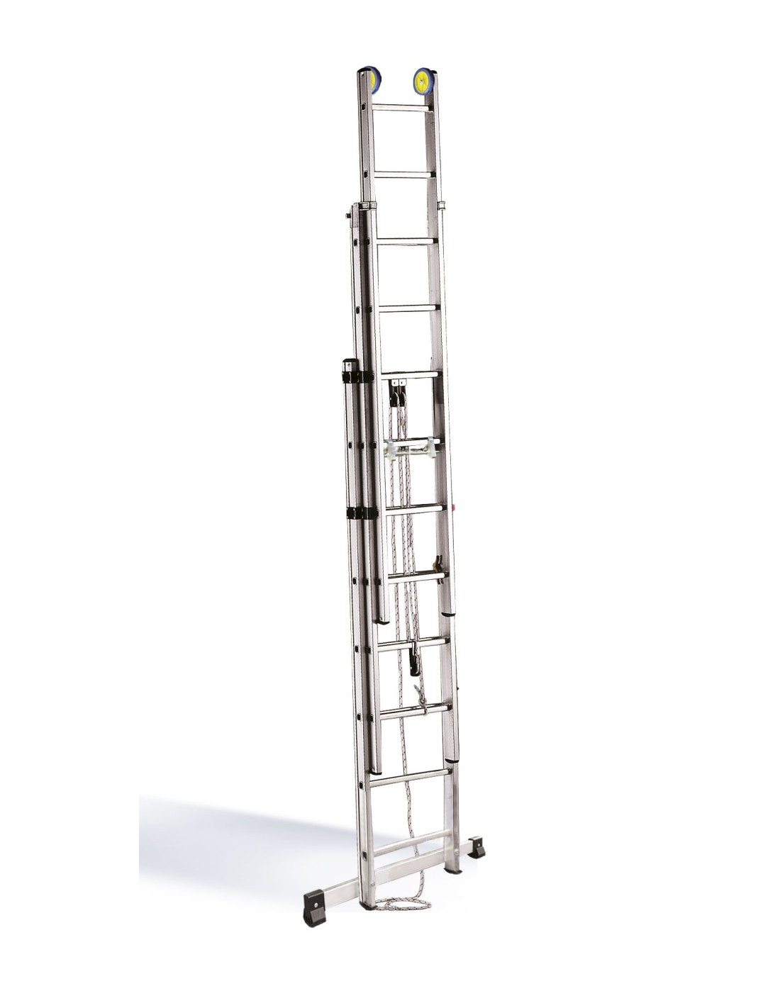 Escalera profesional de tres tramos de aluminio extensible manual mediante cuerda para trabajar en apoyo.