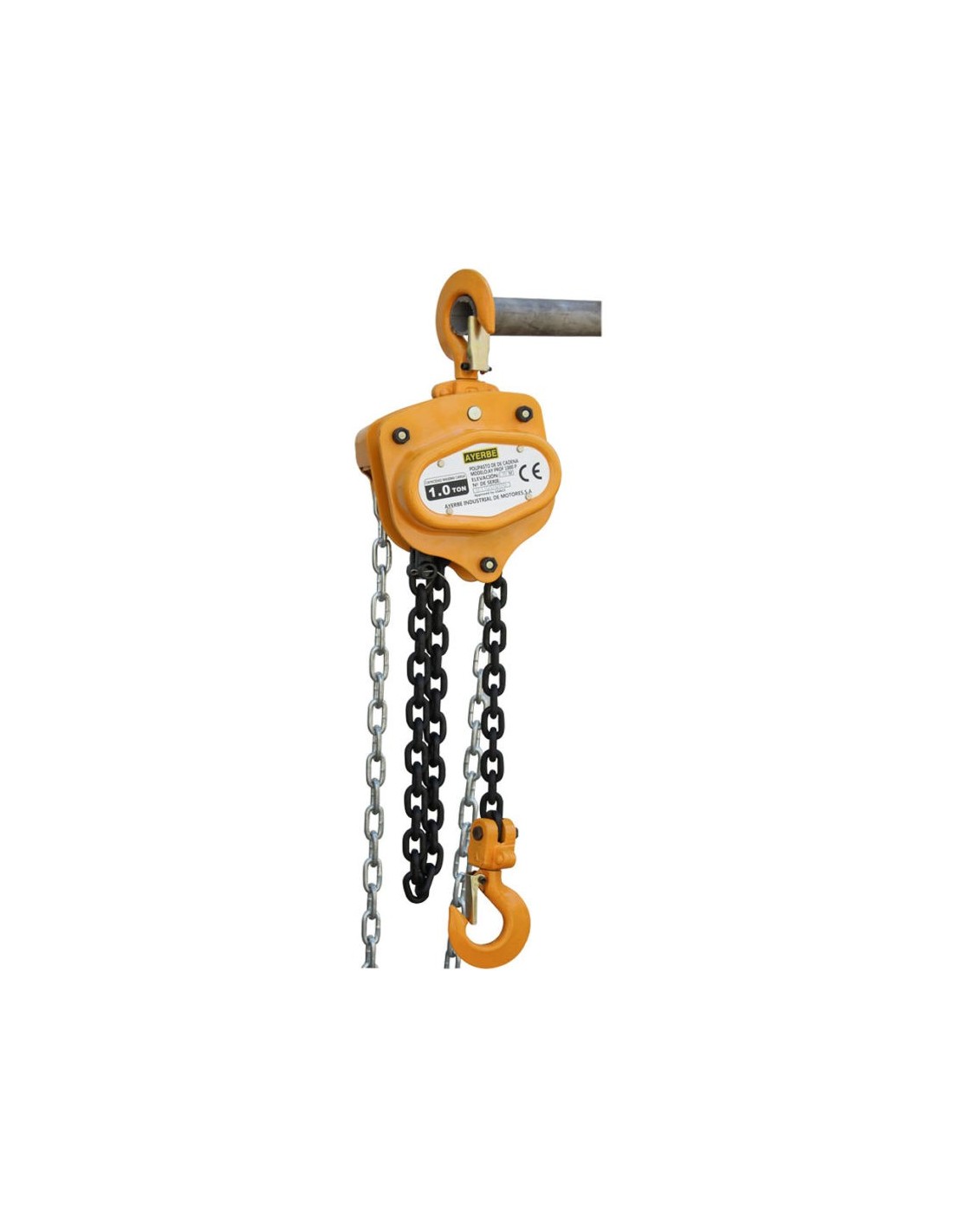 Características • Capacidad máxima: 1000 kg. • Elevación 6 m. 1 cadena • Diámetro cadena: 6 mm. • Medidas: 317 x 140 x 158 mm. • Peso: 16,4 kg