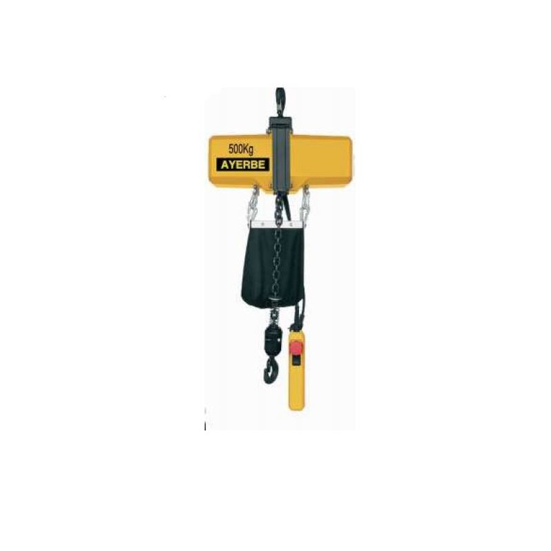 Ayerbe Elevador eléctrico de cadena AY-500 EC Modelo: AY500EC Capacidad máxima: 500 kg. Potencia: 540 W. – 230V. / 50 Hz. Grado de aislamiento: B Grado de protección: IP54 Altura de elevación: 6 m. Velocidad: 2,8 m./min. Factor de servicio: S3-25%-10 MIN. Diámetro de cadena: 6,3 mm. COD.:588020