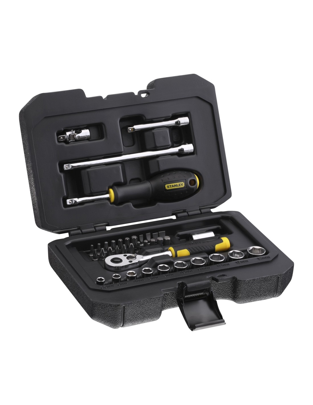10x vasos 1/4’ (6 puntos) : 5,5 – 6 – 7 – 8 – 9 – 10 – 11 – 12 – 13 – 14 mm 2x extensiones 1/4’ : 3” – 5”