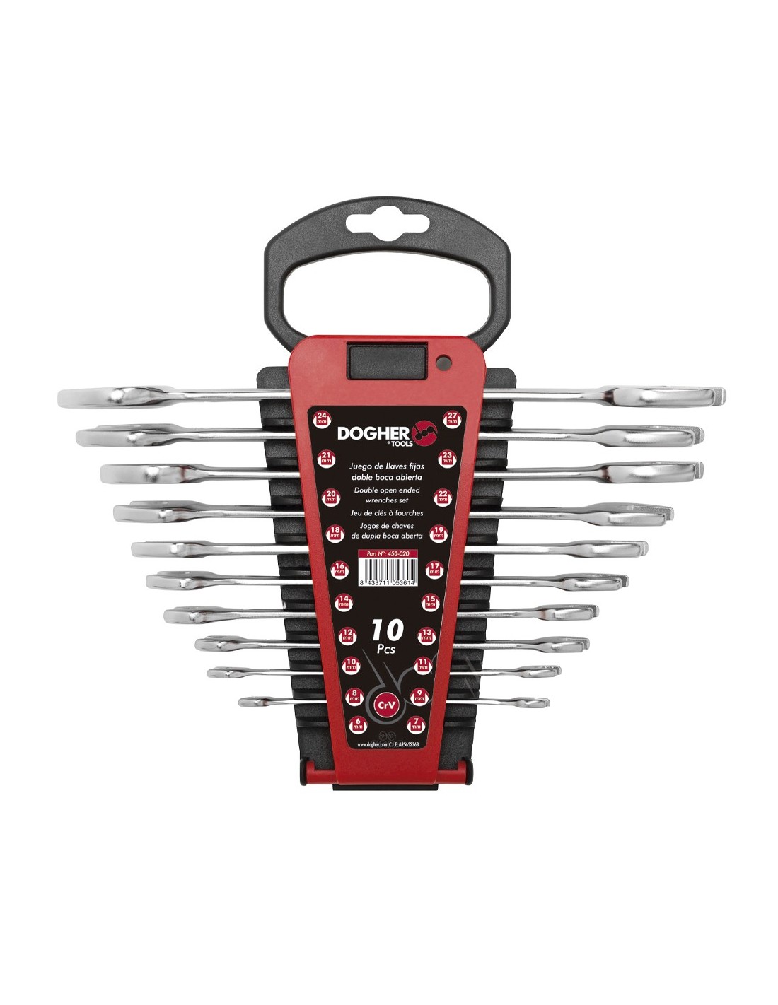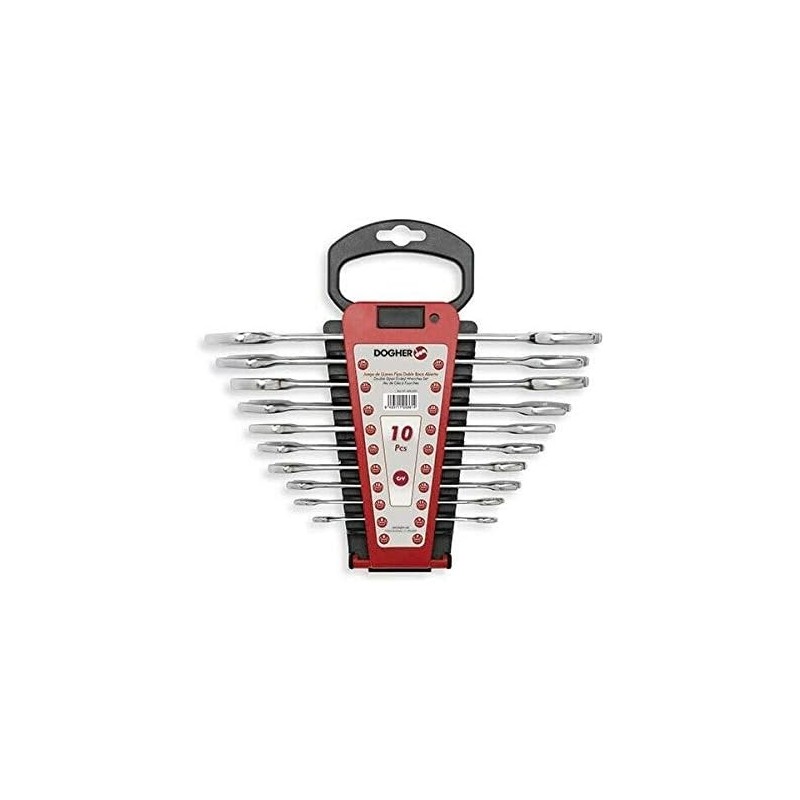 Juego de 10 llaves fijas de doble boca abierta. Herramientas de calidad fabricadas con una aleación de acero y Cromo Vanadio. Medidas: 6x7 - 8x9 - 10x11 - 12x13 – 14x15 - 16x17 - 18x19 - 20x22 - 21x23 - 24x27 mm. En soporte de plástico.