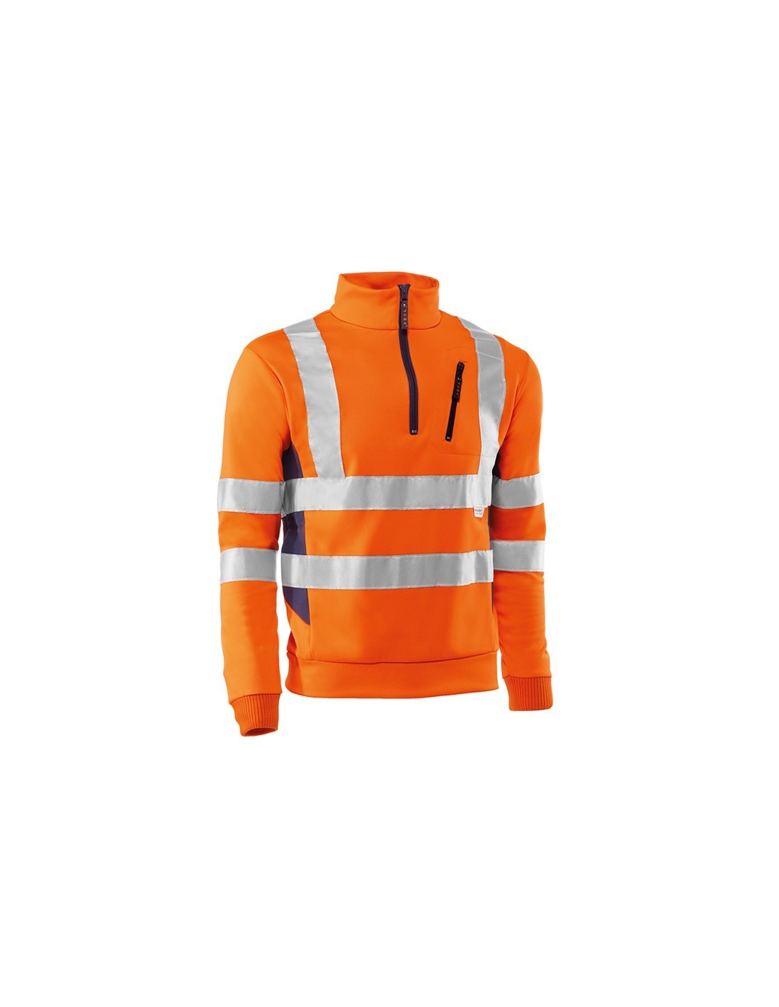 - Sudadera con bandas reflectantes de 3M® ScotchliteTM. Cierre frontal con cremallera desde mitad del pecho hasta el cuello, dispone de un bolsillo frontal con cremallera. Zonas laterales en azul marino.