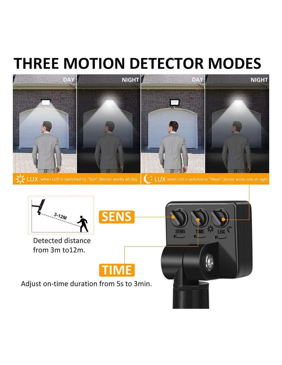 • Detector de movimiento con foco sensible: el foco LED tiene 3 interruptores de ajuste: tiempo, distancia de detección y ajuste día/noche (LUX). Si quieres iluminar durante 24 horas o sólo por la noche, utiliza LUX para realizar los ajustes.