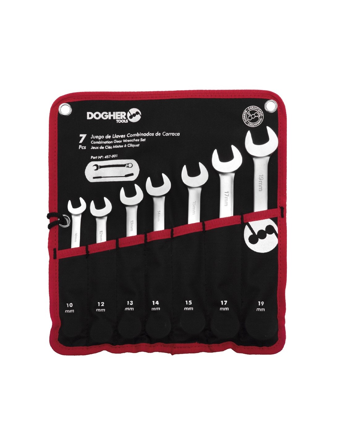 Bolsa nylon con 7 llaves de carraca reversible acodadas. Fabricadas con acero de gran calidad y aleación Cromo Vanadio. • De - 10–12-13–14-15–17-19 mm. • Acodada a 15º En bolsa nylon (300x390 mm).