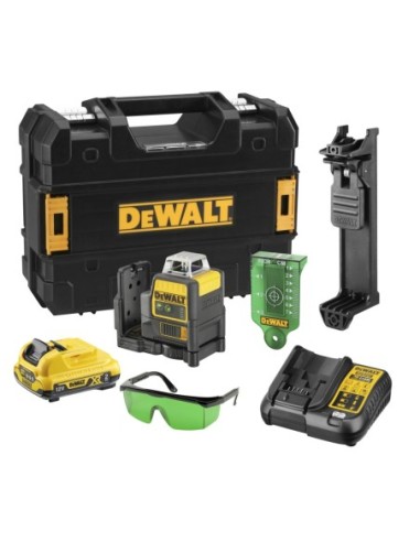 Láser autonivelante 2 lineas 360° - verde. Precisión +/-3mm@10m. Capacidad 30m sin el receptor, 50m con el receptor. Incluye batería Li-Ion 10,8V 2,0Ah. Base pivotante e imantada integrada con rosca 1/4" para uso con trípode. Resistente - engomado: IP65 / 2 metros de test de caída vertical. EQUIPO ESTÁNDAR: batería 10,8V, cargador, soporte de pared y maletín