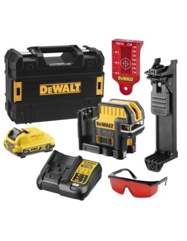 Proyecta dos líneas en cruz+ 5 puntos. Clase 2, autonivelación +/-4°, precisión +/- 3 mm/10m. Proyección de dos líneas en cruz a 90º. Alcance de hasta 20m (sin receptor) y de hasta 50m (con receptor). Incluye batería XR Li-Ion 10,8V 2,0Ah. Báse pivotante mágnetica integrada con rosca de 1/4". IP65/ 2m a prueba de caída. EQUIPO ESTÁNDAR: Batería 10,8V, cargador, soporte de pared, maletín.