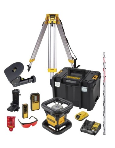 Conjunto láser autonivelante rotativo 45 metros de alcance (457 metros con detector). Precisión 3mm/30m. Nivelación vertical y horizontal. Sellado IP54 contra polvo y agua. Incluye batería DW XR 18V Litio, cargador, soporte mural, detector de línea, maletín TSTAK, gafas, objtetivo, trípode y regla.