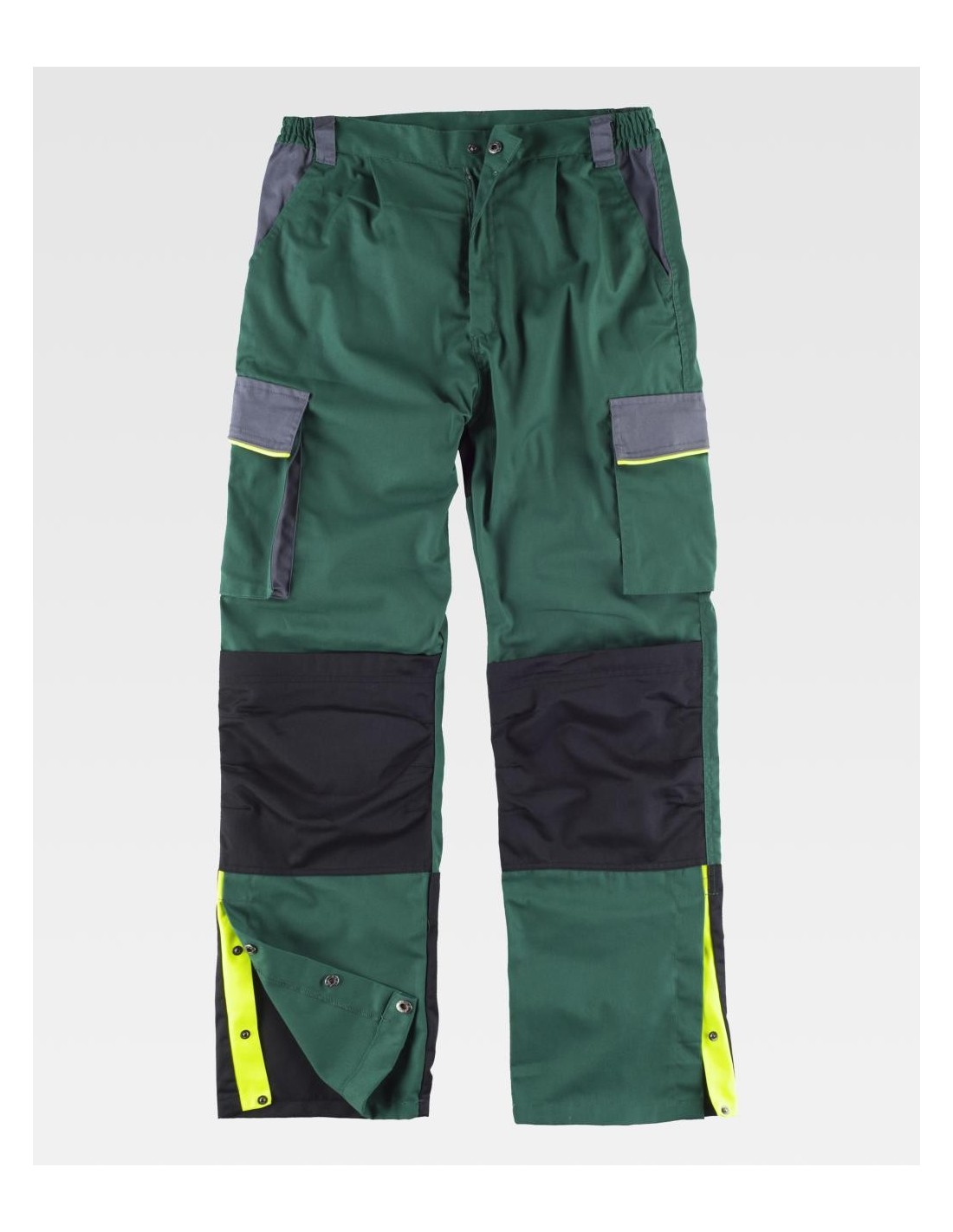 Pantalón tricolor con refuerzos, abertura en perneras y vivos de alta visibilidad. Dos bolsos de abertura inclinada en los costados, dos bolsos laterales de carga con cartera de velcro. Dos bolsos traseros interiores con cartera de velcro. Carteras rematadas con doble vivo. Refuerzo con cierre de cremallera para rodilleras de protección. Refuerzo en culera. Abertura en perneras con cierre de corchetes. Elástico en los laterales de la cintura. Trabillas. Cierre de corchete y bragueta de cremallera.