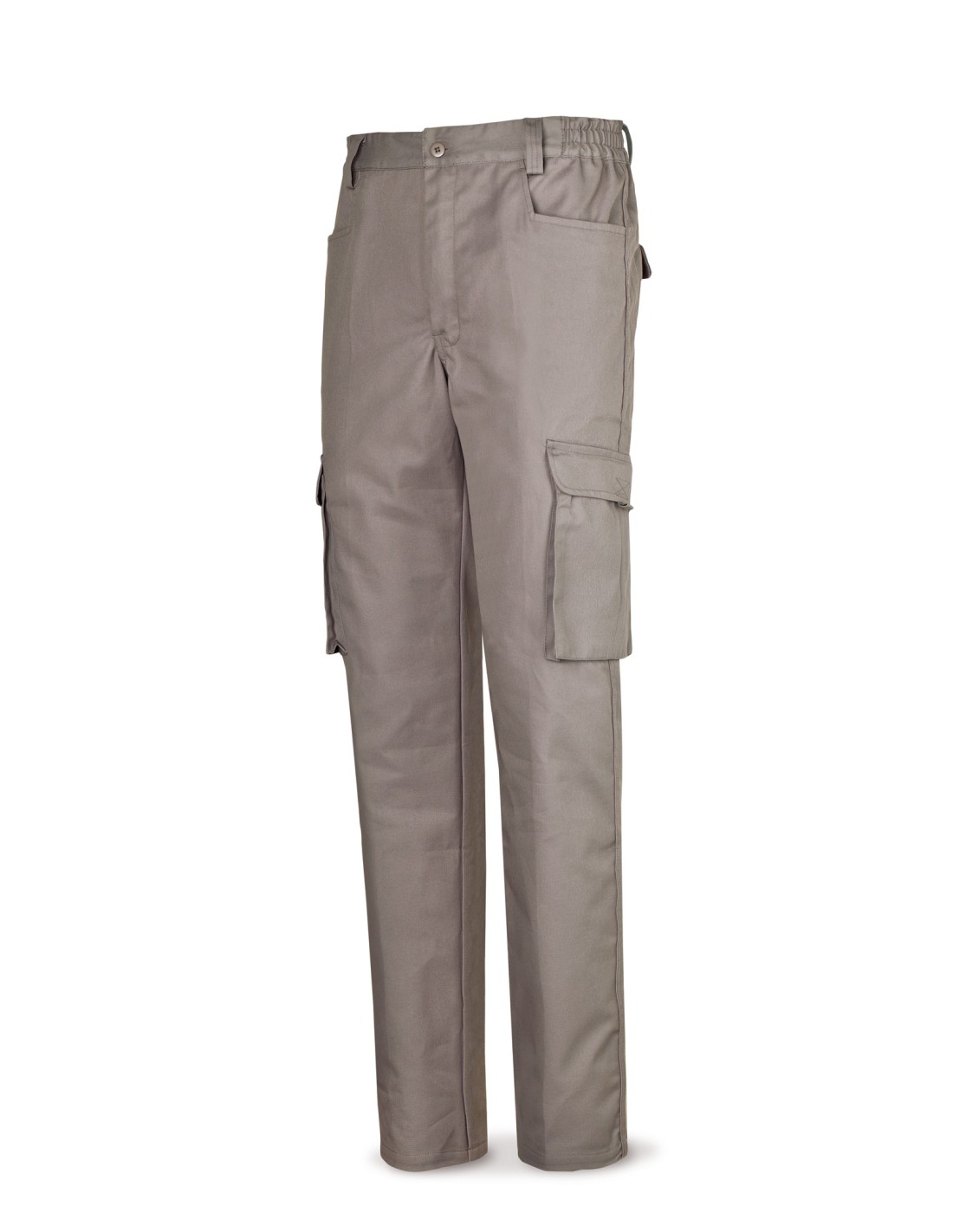 Pantalón gris tergal de 245 g.. 65% poliéster 35% algodón. Bolsillos extra tipo explorador con fuelle y tapeta con velcro en pantalón. Cinturas elasticas. Cremallera de diente ancho. Tapeta cubre cremallera.