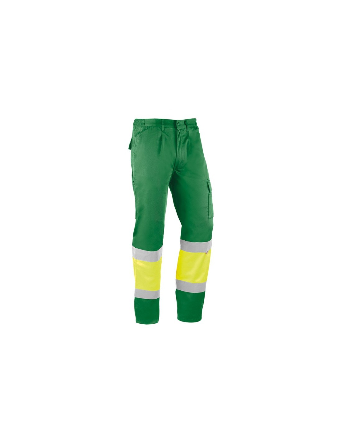 - Pantalón multibolsillos con bandas reflectantes. Dispone de dos bolsillos superiores, dos traseros con velcro y tapeta y uno lateral. Cierre de cremallera y botón a presión. Cintura con elásticos laterales. Hebillas en cintura.