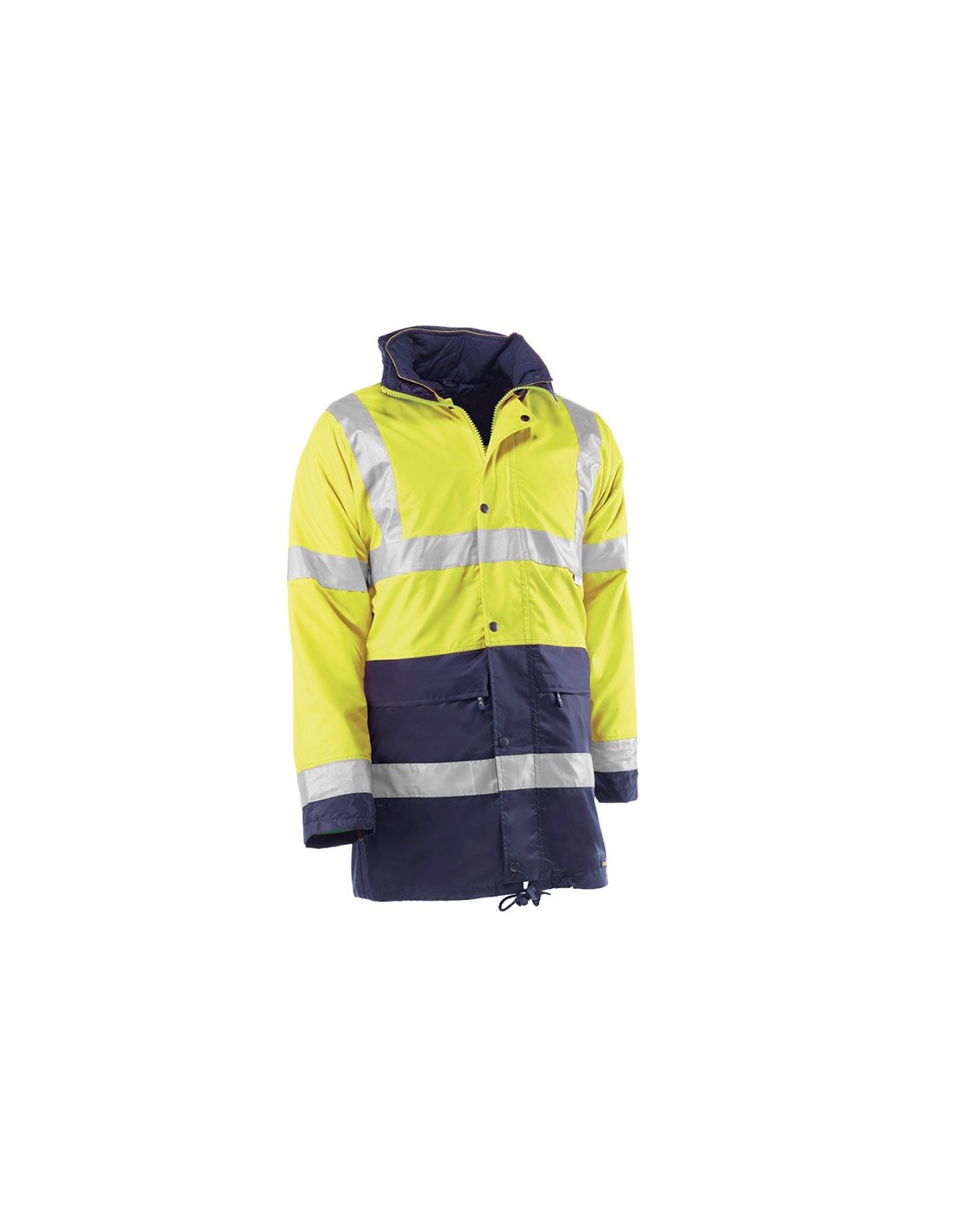 - Bandas de 3M® ScotchliteTM. Dos bolsillos frontales y uno interior. Dispone en su interior de una chaqueta reversible con mangas desmontables, dispone de dos bolsillos y uno interior, con bandas reflectantes 3M® y puño elástico. Capucha interior fija con cierre de velcro. Cordón en la parte inferior para mayor ajuste.