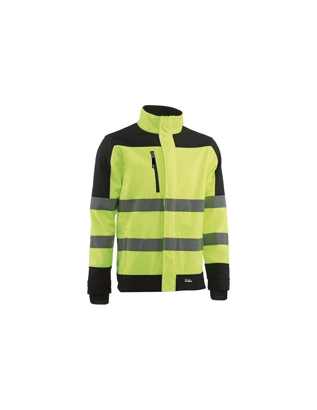 Chaqueta Softshell de alta visibilidad bicolor amarillo y negro con bandas reflectantes.. Descripción