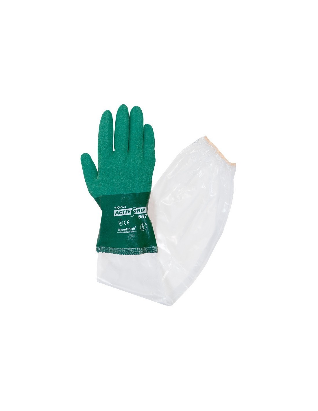 Guante con manguito termosellado de PVC de nitrilo poroso Microfinish® sobre soporte de algodón sin costuras. Características