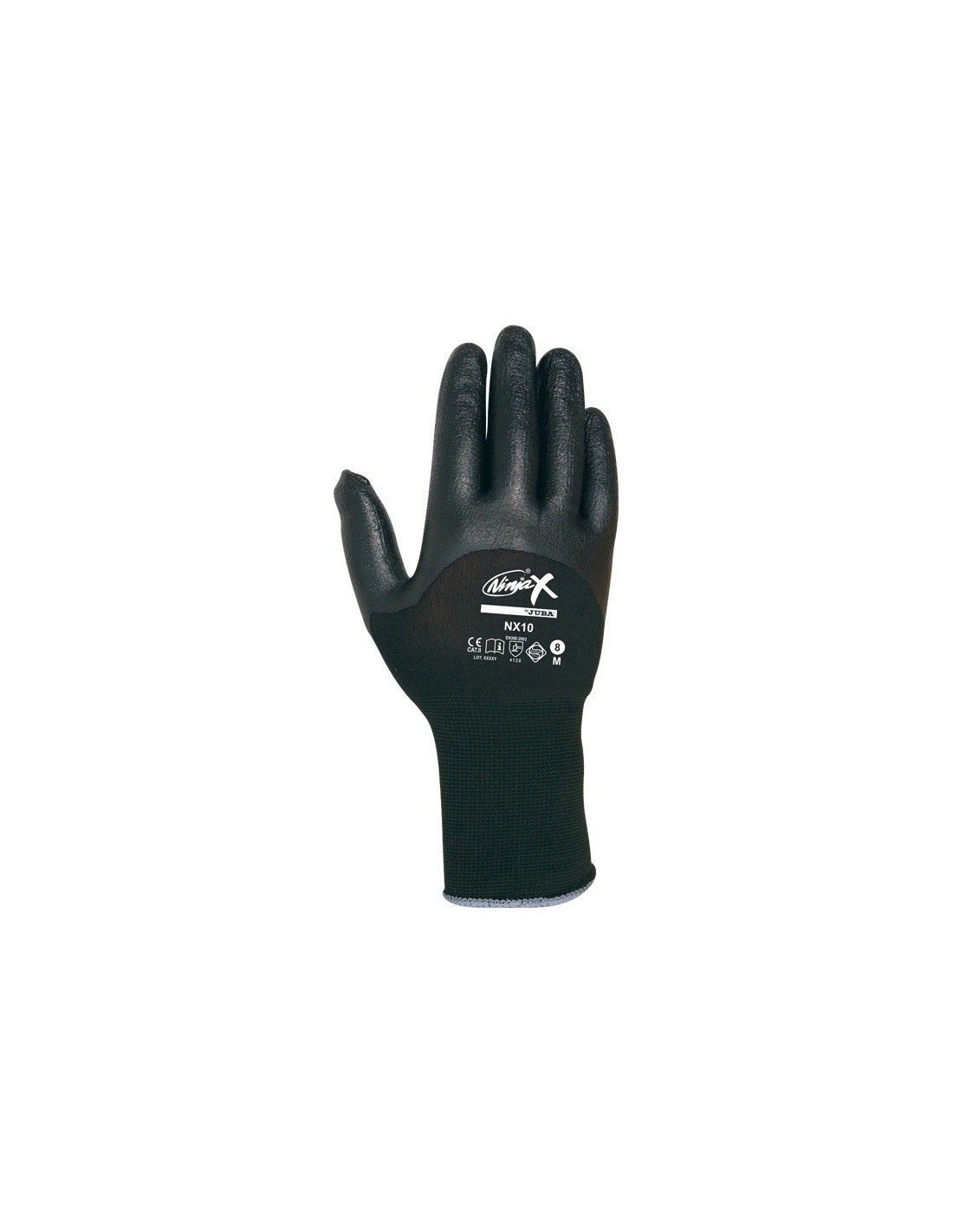 Guante de Nylon® sin costuras, elástico, recubierto en palma y medio dorso con bipolímero (mezcla de poliuretano y nitrilo).. Rasgos