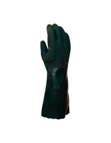 Guantelete de PVC verde con acabado arenoso y forro interior de algodón interlock con refuerzo extra en la palma.. Características
