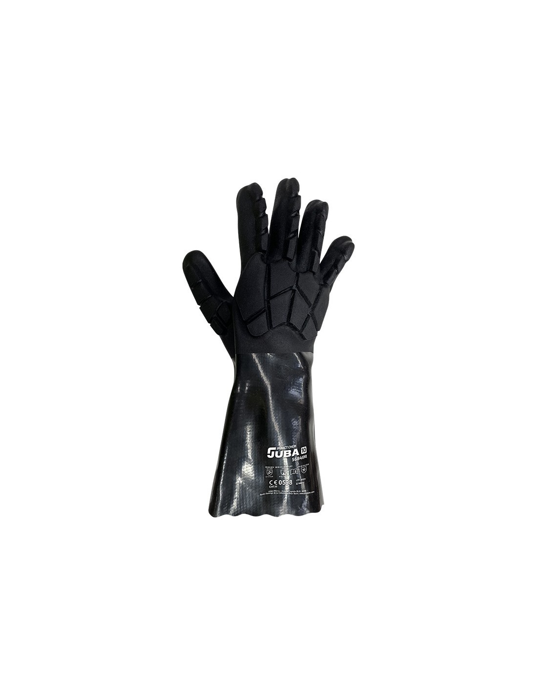 - Doble recubrimiento de PVC con acabado rugoso en la mano, que ofrece alta resistencia a los aceites, alcoholes y detergentes y un sólido agarre.