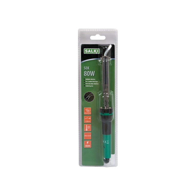 Potencia: 80 W Temp. máxima: 500ºC Tiempo para 300ºC: 80 segundos Materia punta: cobre y hierro niquelado. Estañadas. Longitud del cable: 1,35 m Peso sin cable: 180 g