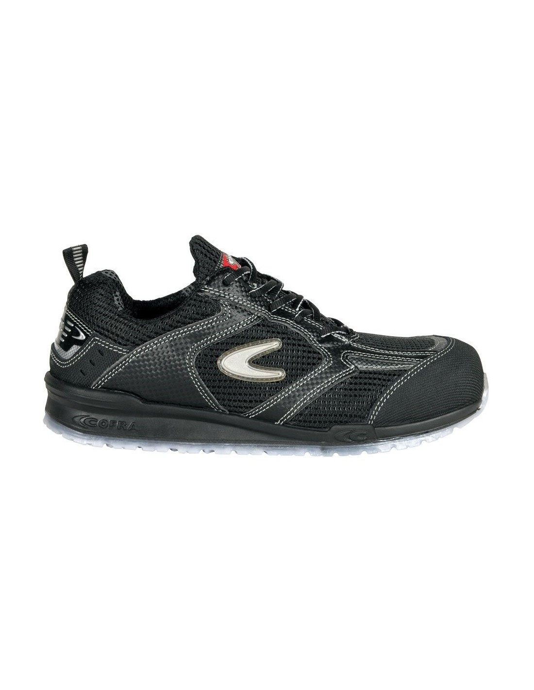 Normativa: EN ISO 20345:2011. Superior: transpirable tela Breatex con textura 3D y Microtech. Forro exterior: tela BREATEX, muy transpirable. Forro interior: SANY-DRY, tejido 100% poliéster, tridimensional, transpirable, antibacteriano, que absorbe y expulsa la humedad, resistente a la abrasión. Plantilla: COFRA SOFT, plantilla anatómica de poliuretano con aroma, con agujeros, antiestática, suave y cómoda; la forma de la parte inferior garantiza absorción de la energía de impacto (shock absorber) y algo agarre; la parte superior absorbe la humedad y mantiene el pie seco. Suela: poliuretano/poliuretano termoplástico. Puntera: Aluminio 200 J. Entresuela: no metálica. APT plate – cero perforación. Ancho: 11 puntos del sistema Mondopoint.